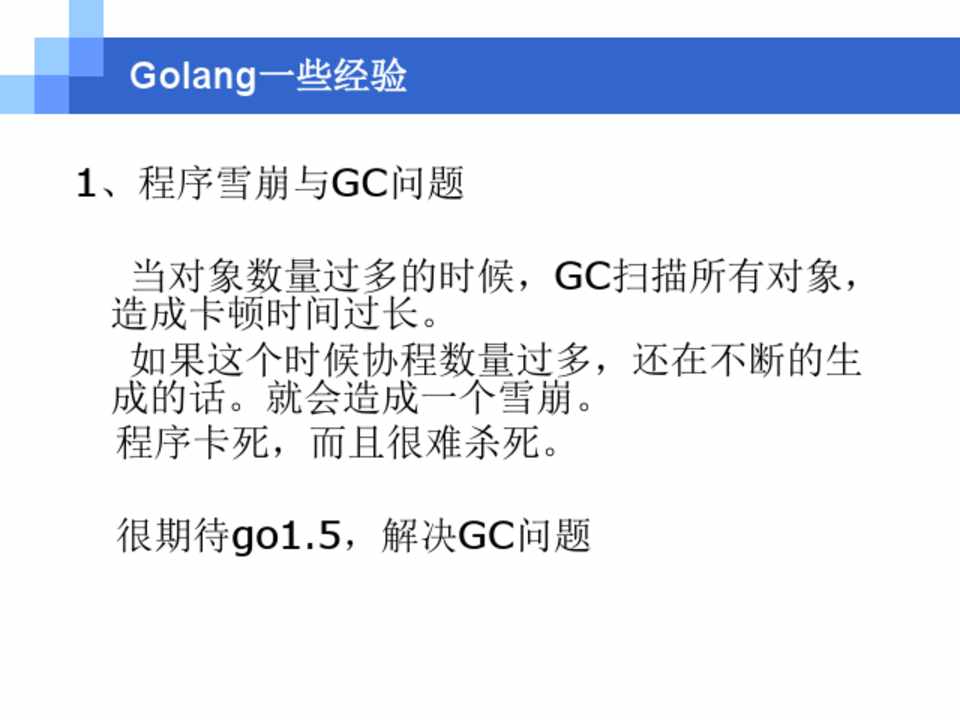 当对象数量过多的时候,GC扫描所有对象, 造成卡顿时间过长。 如果这个时候协程数量过多,还在不断的生 成的话。就会造成一个雪崩。 程序卡死,而且很难杀死。
