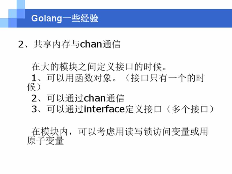 在大的模块之间定义接口的时候。 1、可以用函数对象。(接口只有一个的时 候) 2、可以通过chan通信 3、可以通过interface定义接口(多个接口)
