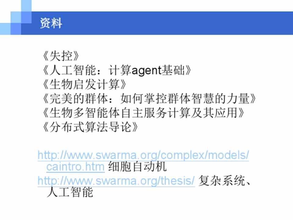 《失控》 《人工智能:计算agent基础》 《生物启发计算》 《完美的群体:如何掌控群体智慧的力量》 《生物多智能体自主服务计算及其应用》 《分布式算法导论》