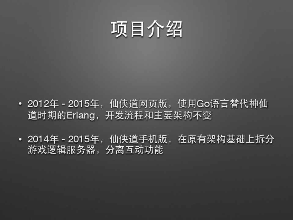 • 2012年 - 2015年,仙侠道⺴⽹网⻚页版,使⽤用Go语⾔言替代神仙 道时期的Erlang,开发流程和主要架构不变