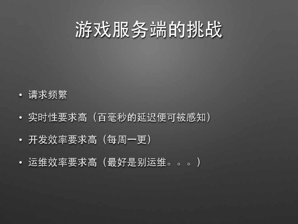 • 请求频繁 • 实时性要求⾼高(百毫秒的延迟便可被感知) • 开发效率要求⾼高(每周⼀一更) • 运维效率要求⾼高(最好是别运维。。。)