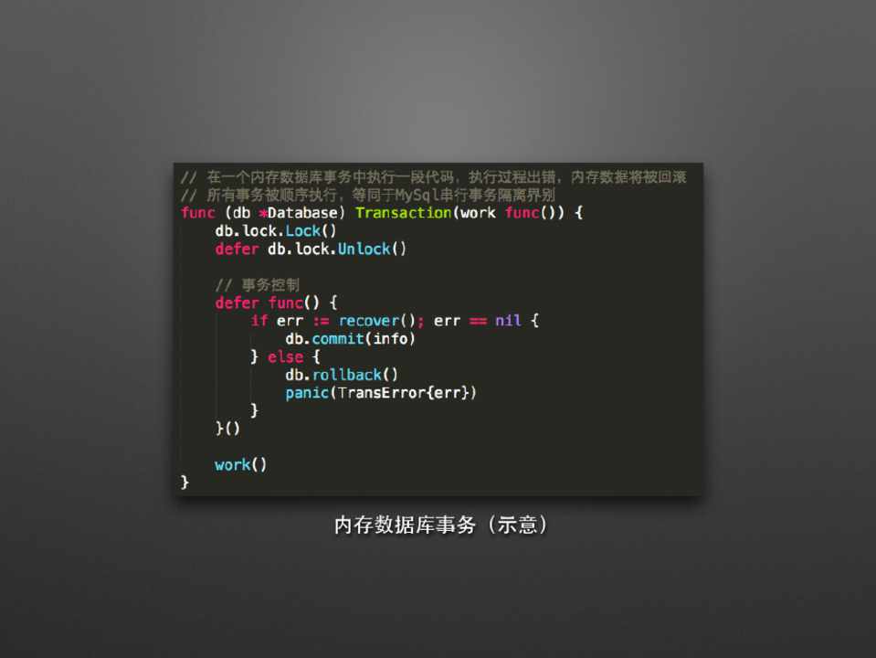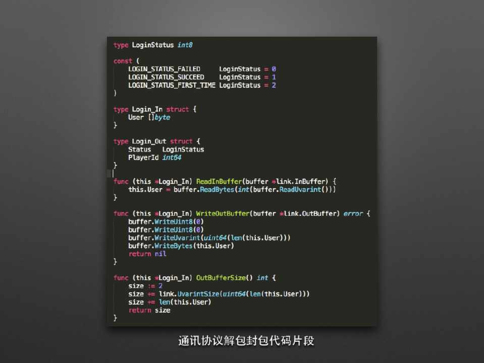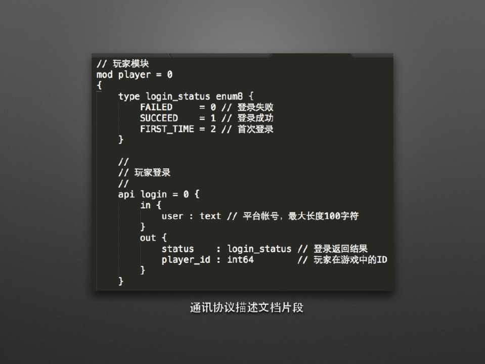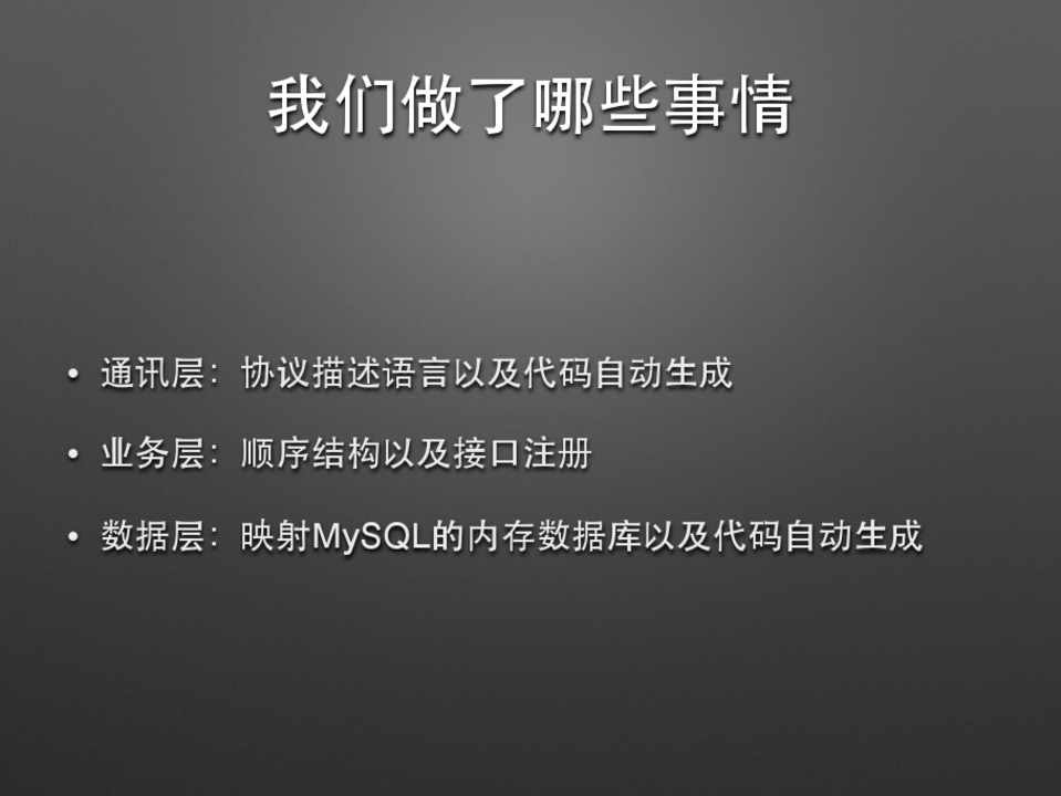 • 通讯层:协议描述语⾔言以及代码⾃自动⽣生成 • 业务层:顺序结构以及接⼝口注册 • 数据层:映射MySQL的内存数据库以及代码⾃自动⽣生成
