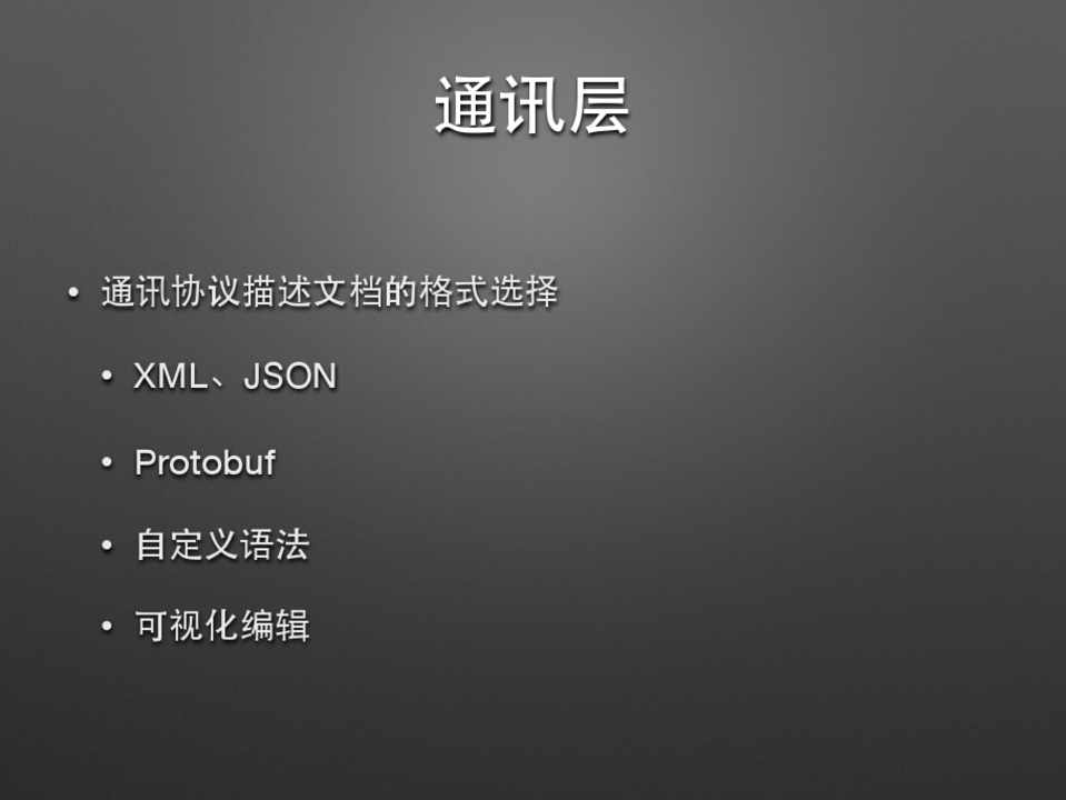 • 通讯协议描述⽂文档的格式选择 • XML、JSON • Protobuf • ⾃自定义语法 • 可视化编辑