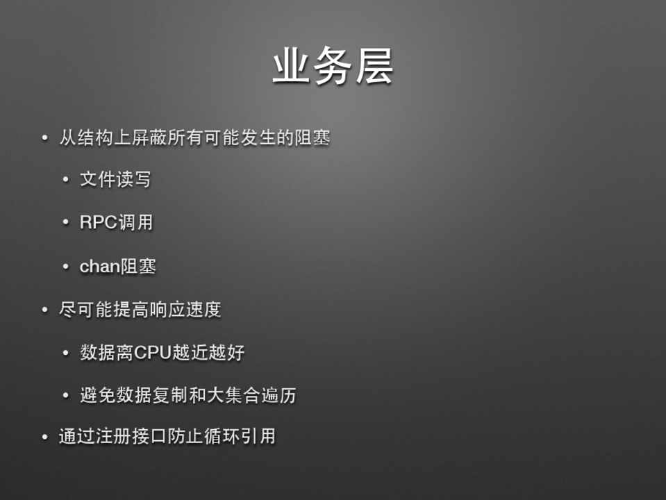 • 从结构上屏蔽所有可能发⽣生的阻塞 • ⽂文件读写 • RPC调⽤用 • chan阻塞