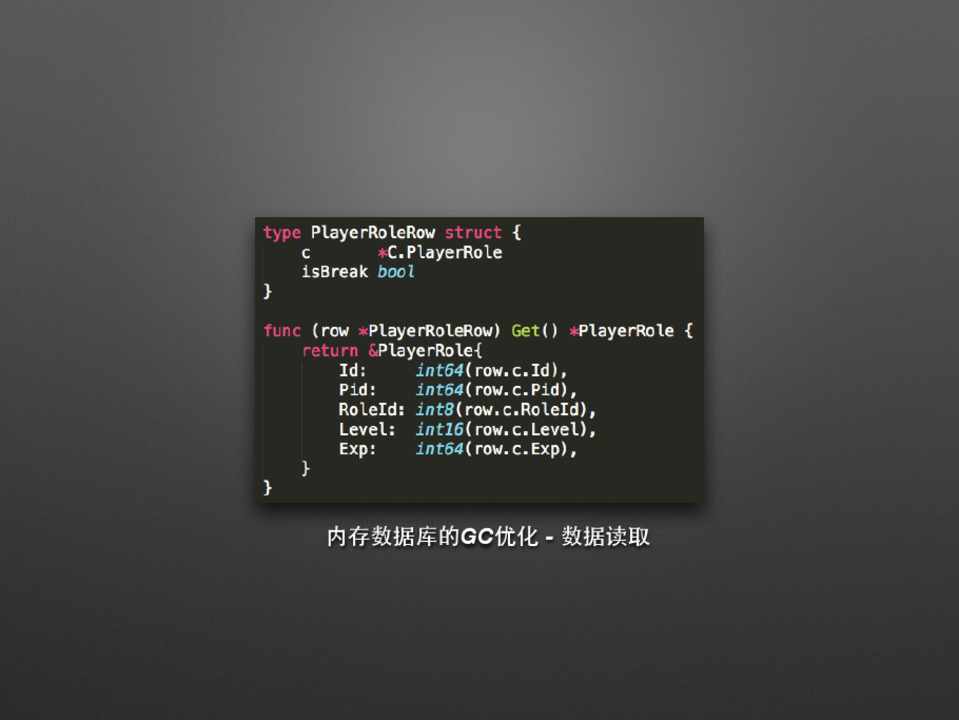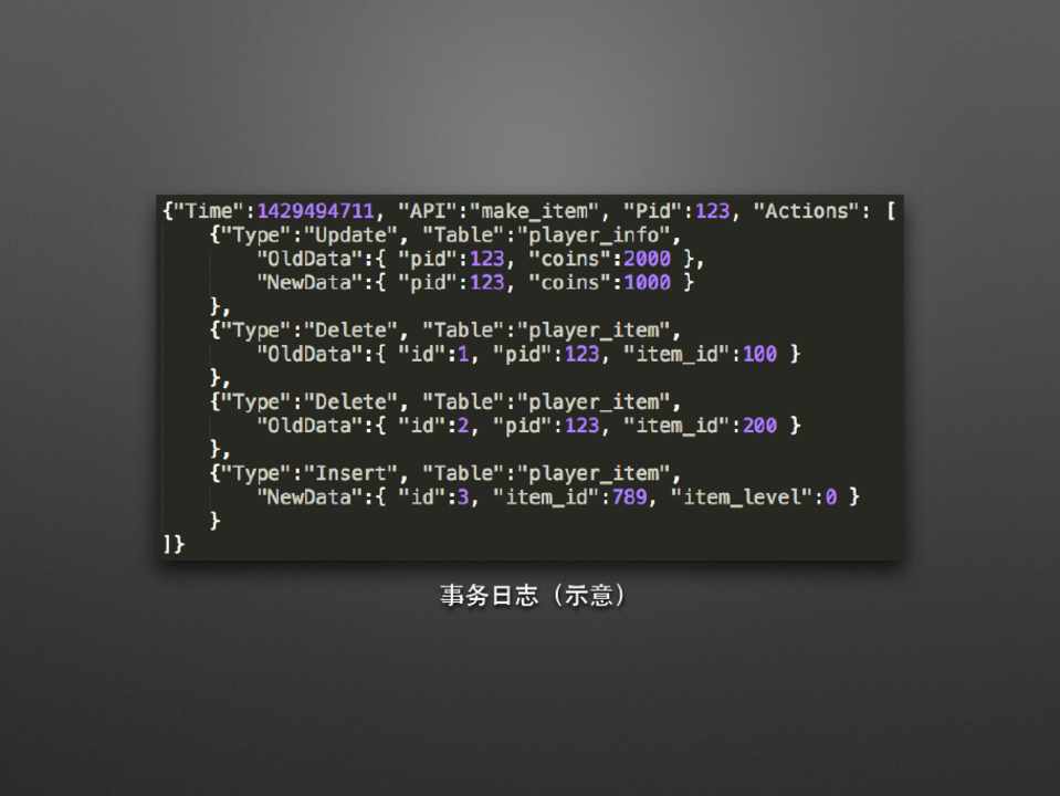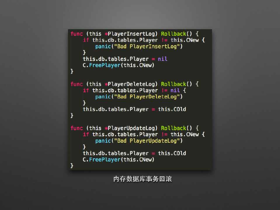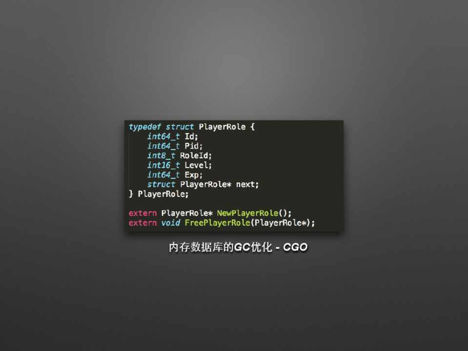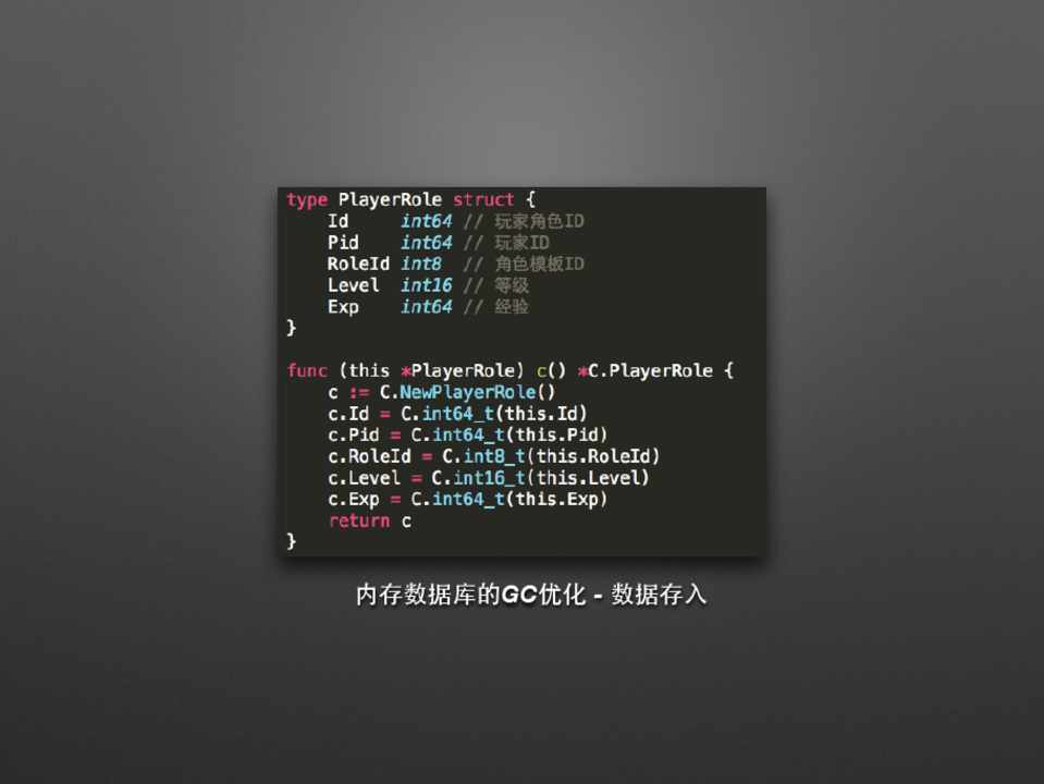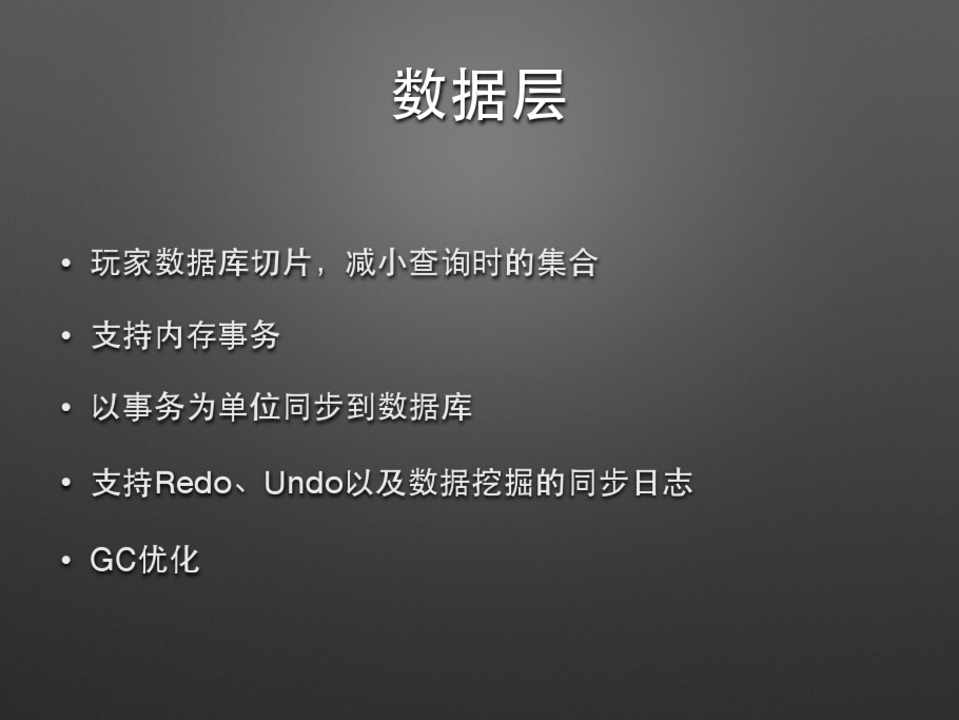 • 玩家数据库切⽚片,减⼩小查询时的集合 • ⽀支持内存事务 • 以事务为单位同步到数据库 • ⽀支持Redo、Undo以及数据挖掘的同步⽇日志 • GC优化