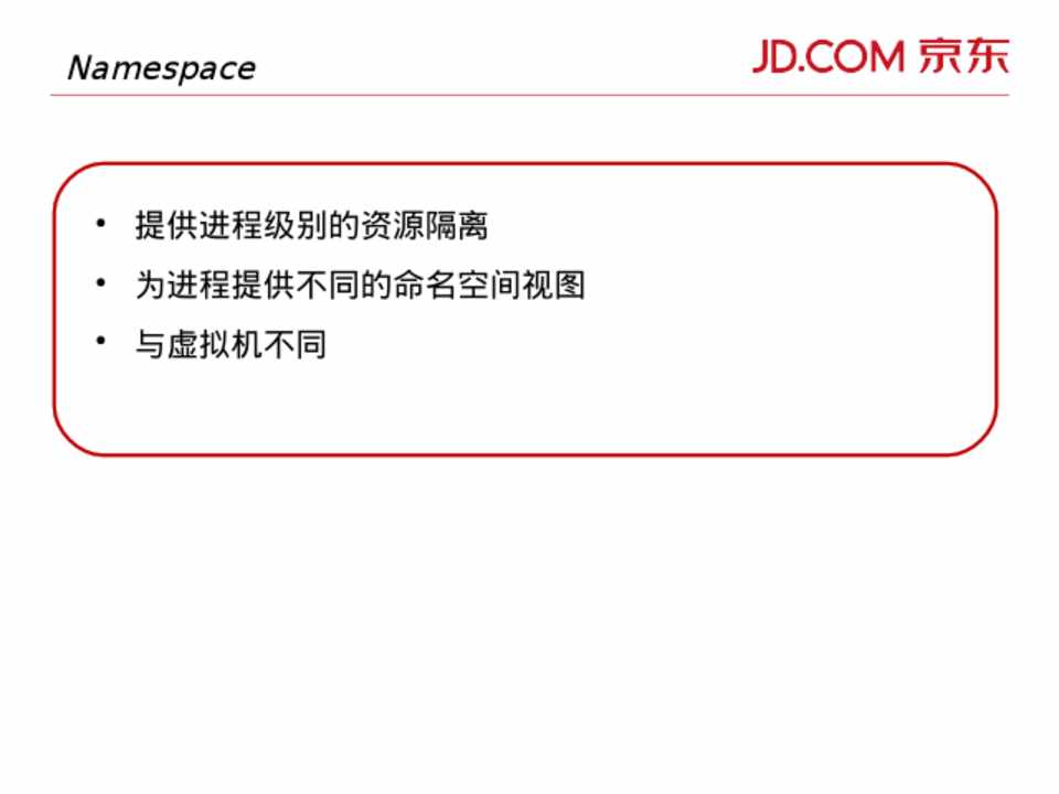 • 提供进程级别的资源隔离 • 为进程提供不同的命名空间视图 • 与虚拟机不同