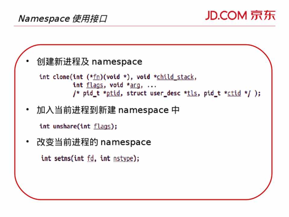 • 加入当前进程到新建 namespace 中 • 改变当前进程的 namespace
