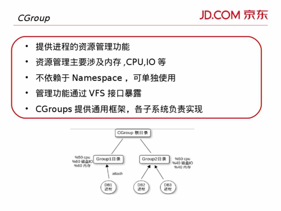 • 提供进程的资源管理功能 • 资源管理主要涉及内存 ,CPU,IO 等 • 不依赖于 Namespace ,可单独使用 • 管理功能通过 VFS 接口暴露 • CGroups 提供通用框架,各子系统负责实现