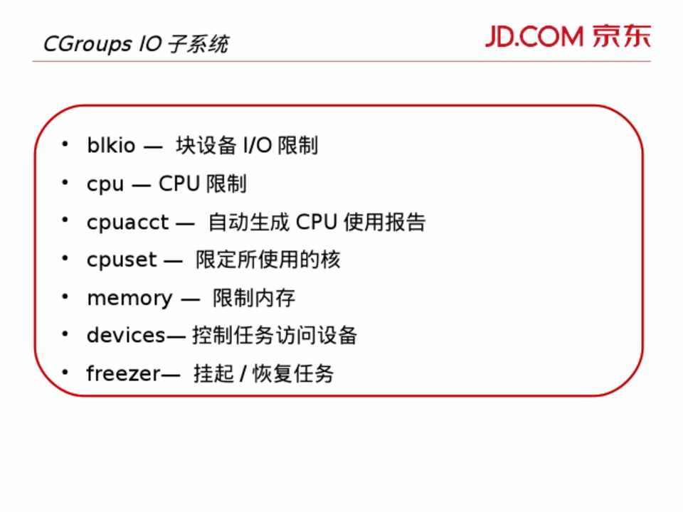 • blkio — 块设备 I/O 限制 • cpu — CPU 限制 • cpuacct — 自动生成 CPU 使用报告 • cpuset — 限定所使用的核 • memory — 限制内存 • devices— 控制任务访问设备 • freezer— 挂起 / 恢复任务