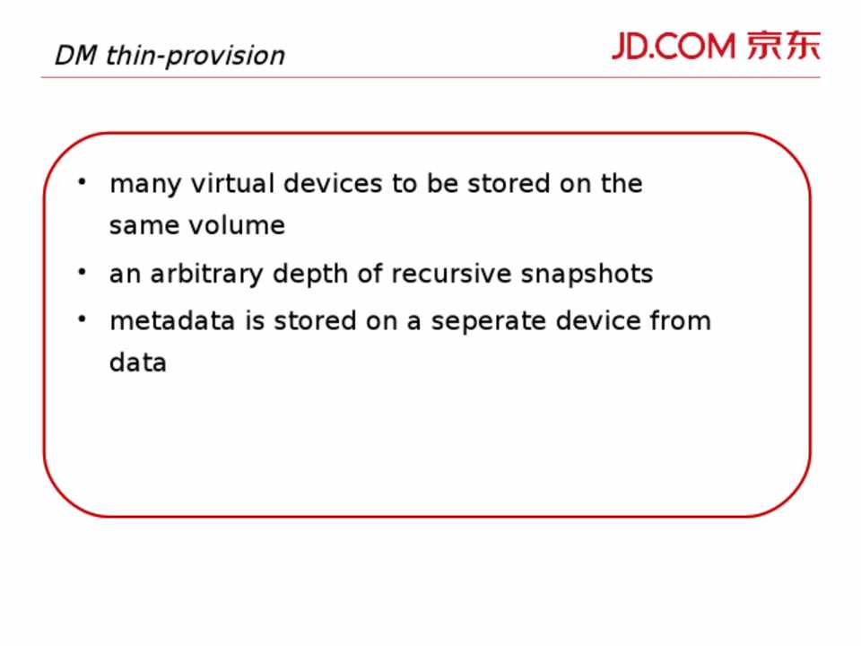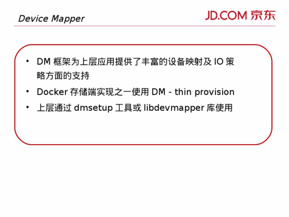 • Docker 存储端实现之一使用 DM - thin provision • 上层通过 dmsetup 工具或 libdevmapper 库使用