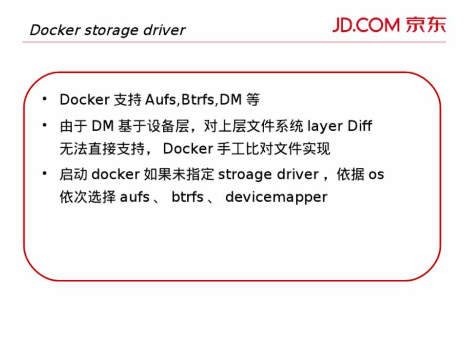 • Docker 支持 Aufs,Btrfs,DM 等 • 由于 DM 基于设备层,对上层文件系统 layer Diff