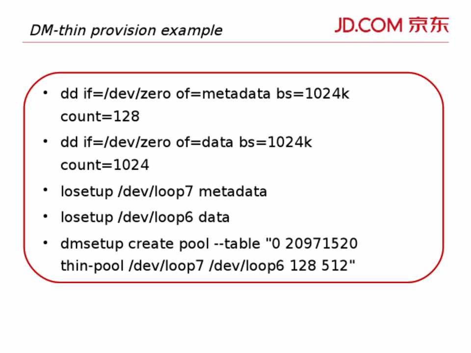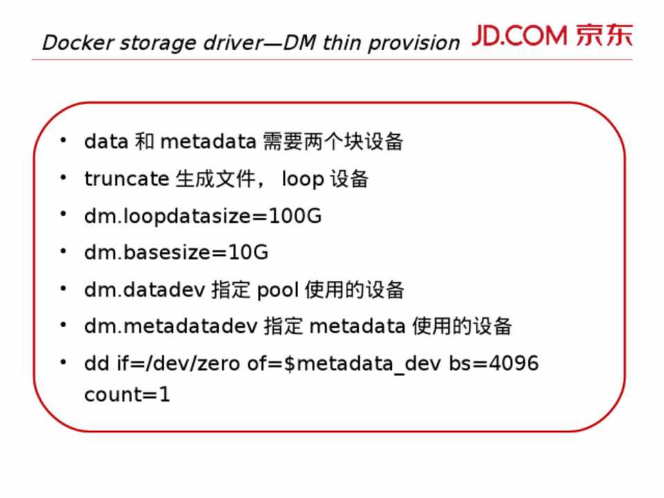 • data 和 metadata 需要两个块设备 • truncate 生成文件, loop 设备 • dm.loopdatasize=100G • dm.basesize=10G • dm.datadev 指定 pool 使用的设备 • dm.metadatadev 指定 metadata 使用的设备 • dd if=/dev/zero of=$metadata_dev bs=4096