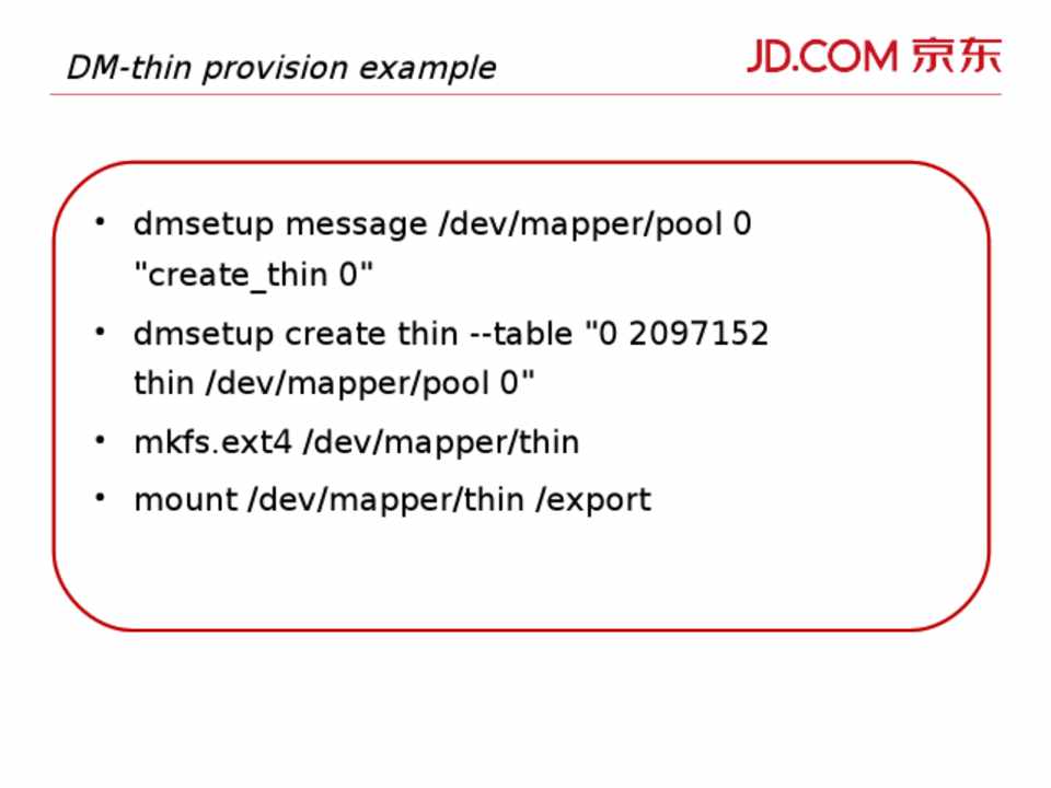 • mkfs.ext4 /dev/mapper/thin • mount /dev/mapper/thin /export
