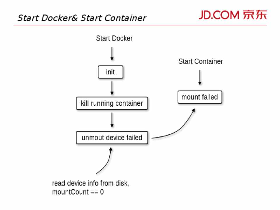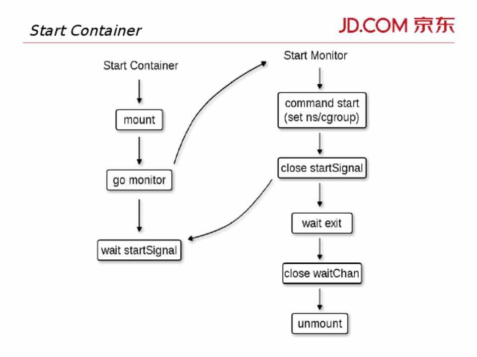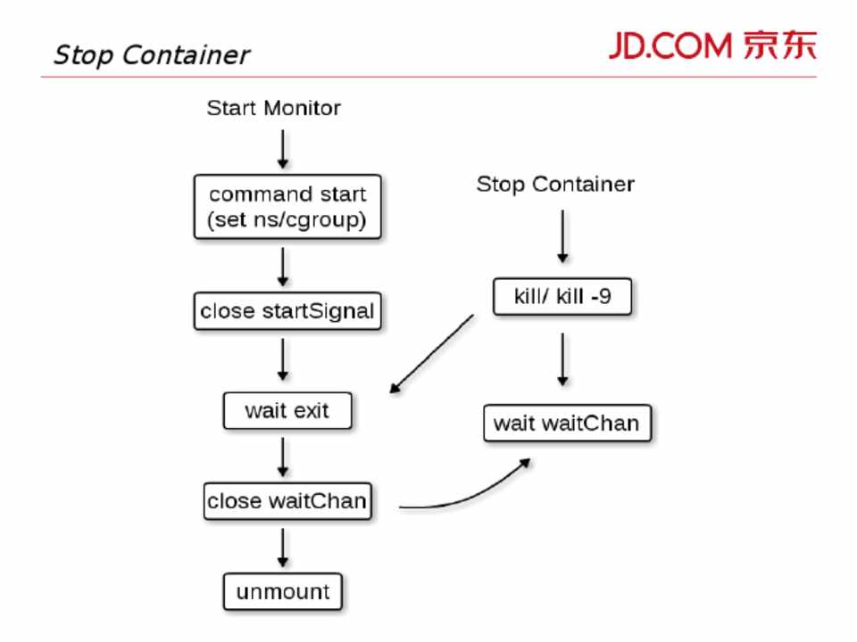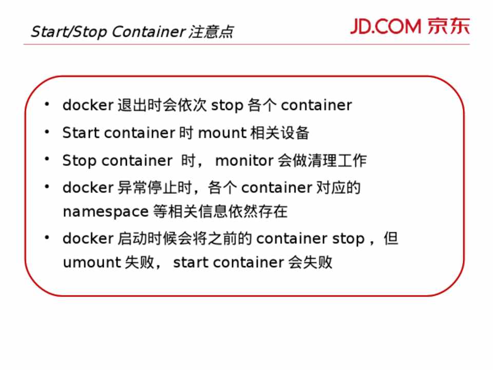 • docker 退出时会依次 stop 各个 container • Start container 时 mount 相关设备 • Stop container 时, monitor 会做清理工作 • docker 异常停止时,各个 container 对应的