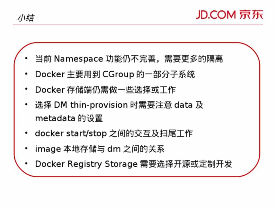 • 当前 Namespace 功能仍不完善,需要更多的隔离 • Docker 主要用到 CGroup 的一部分子系统 • Docker 存储端仍需做一些选择或工作 • 选择 DM thin-provision 时需要注意 data 及