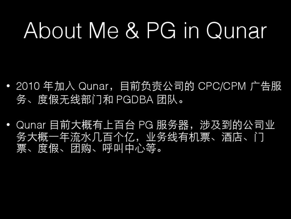 • Qunar ⺫⽬目前⼤大概有上百台 PG 服务器,涉及到的公司业 务⼤大概⼀一年流⽔水⼏几百个亿,业务线有机票、酒店、门 票、度假、团购、呼叫中⼼心等。