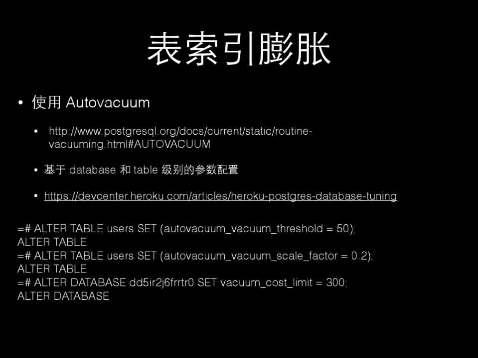 =# ALTER TABLE users SET (autovacuum_vacuum_threshold = 50); ALTER TABLE =# ALTER TABLE users SET (autovacuum_vacuum_scale_factor = 0.2); ALTER TABLE =# ALTER DATABASE dd5ir2j6frrtr0 SET vacuum_cost_limit = 300; ALTER DATABASE