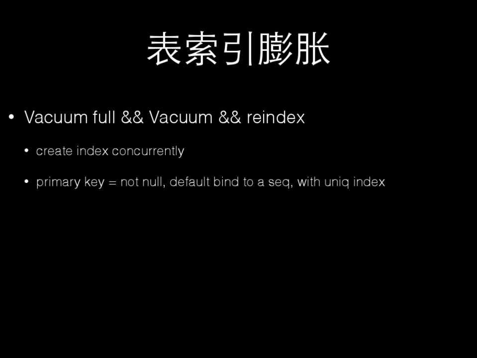 • create index concurrently • primary key = not null, default bind to a seq, with uniq index