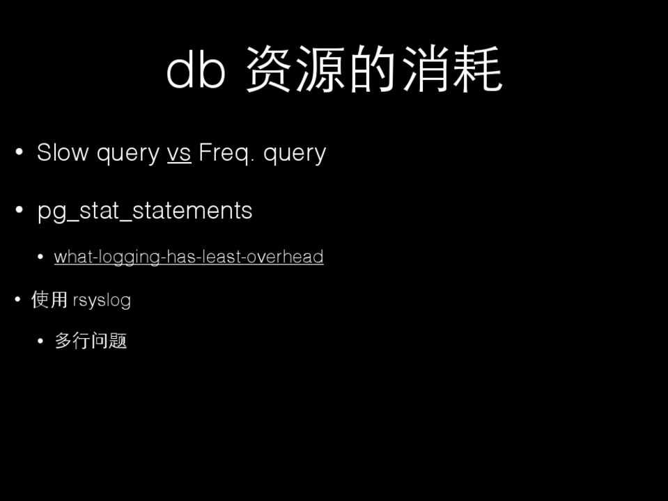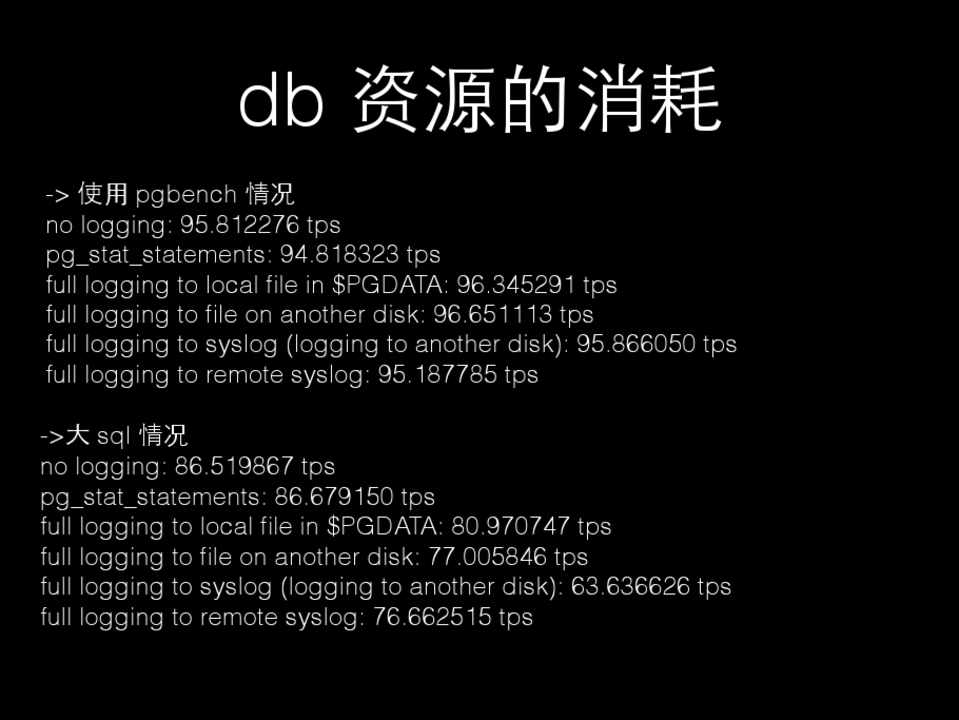 ->⼤大 sql 情况 no logging: 86.519867 tps pg_stat_statements: 86.679150 tps full logging to local file in $PGDATA: 80.970747 tps full logging to file on another disk: 77.005846 tps full logging to syslog (logging to another disk): 63.636626 tps full logging to remote syslog: 76.662515 tps