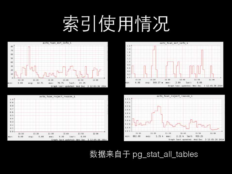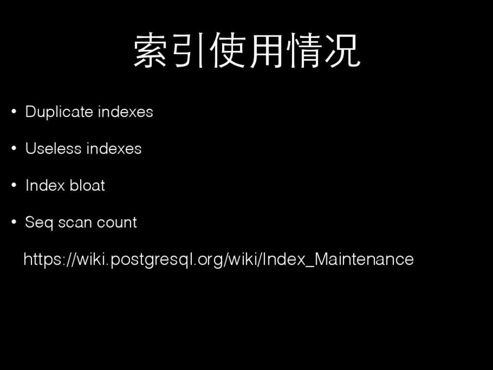• Duplicate indexes • Useless indexes • Index bloat • Seq scan count
