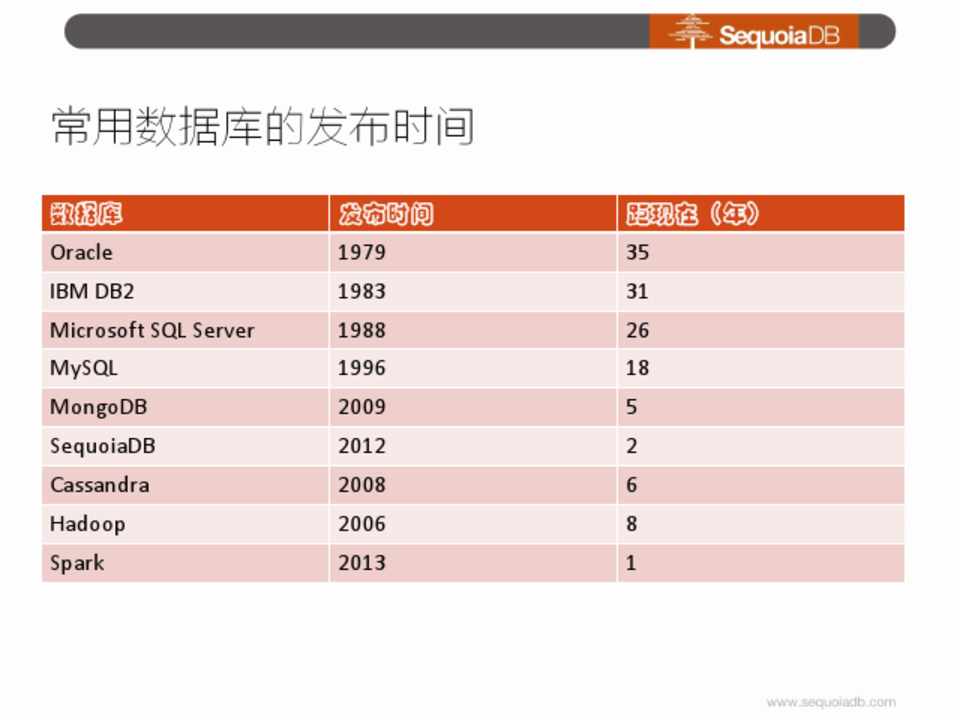 数据库 Oracle IBM DB2 Microsoft SQL Server MySQL MongoDB SequoiaDB Cassandra Hadoop Spark