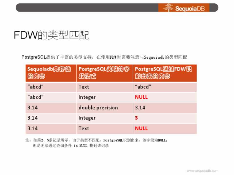PostgreSQL提供了丰富的类型支持,在使用FDW时需要注意与Sequoiadb的类型匹配