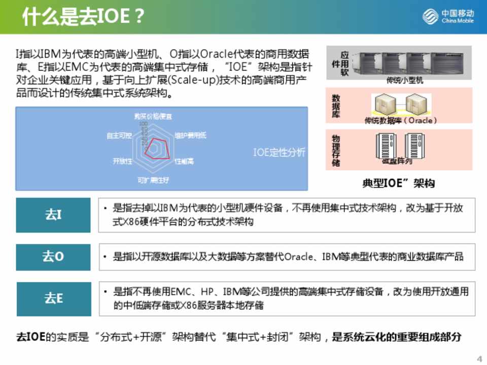去IOE的实质是“分布式+开源”架构替代“集中式+封闭”架构,是系统云化的重要组成部分