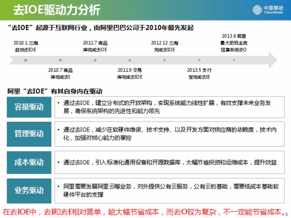 阿里是去IOE的技术先行者和创新者; 阿里对去IOE的宣传去IOE并非单纯的技术出发点; 去IOE我们应该从技术角度分析;