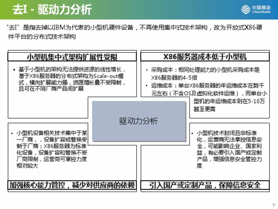 • 小型机设备相关技术集中于某 一厂商,,设备扩容或替换受 制于厂商;X86服务器为标准 化设备,设备扩容和替换不受 厂商限制,运营商可掌控力度 相对较大