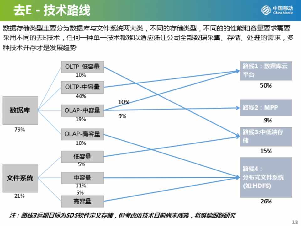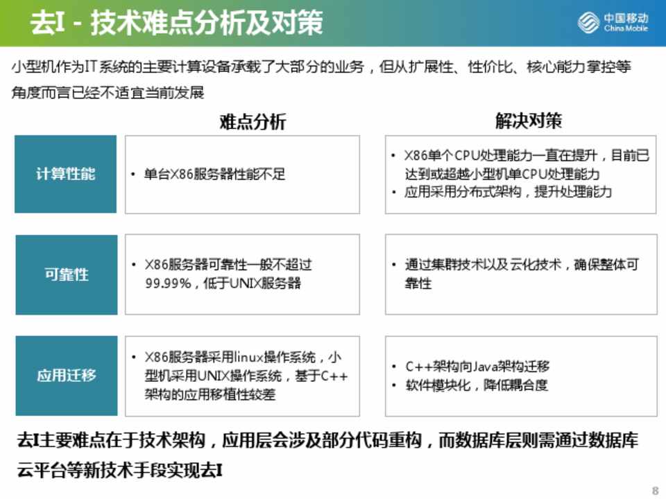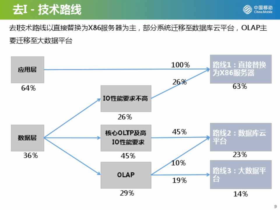 去I技术路线以直接替换为X86服务器为主,部分系统迁移至数据库云平台,OLAP主 要迁移至大数据平台