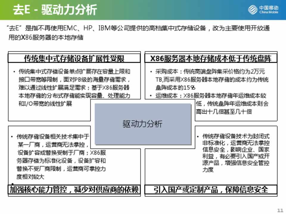 成本驱动 • 通过去IOE,引入标准化通用设备和开源数据库,大幅节省投资和运维成本,提升效益