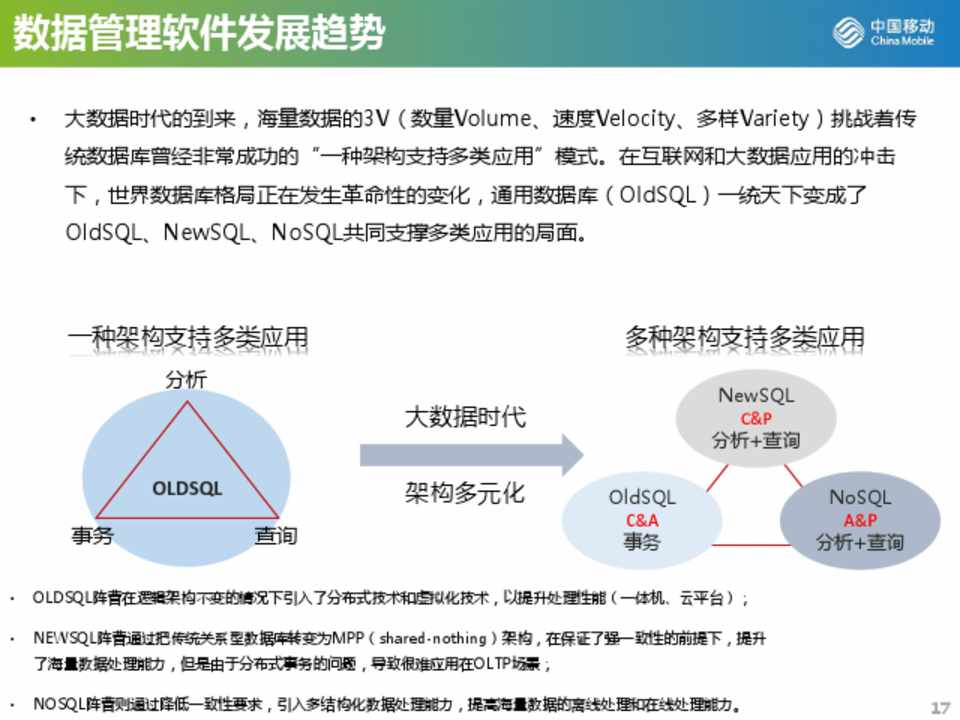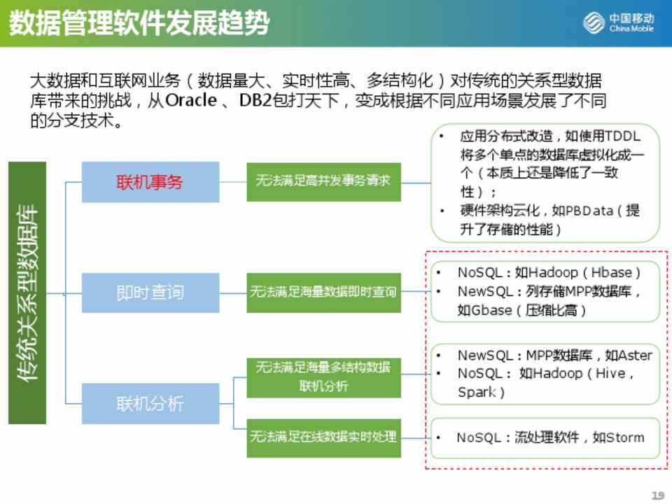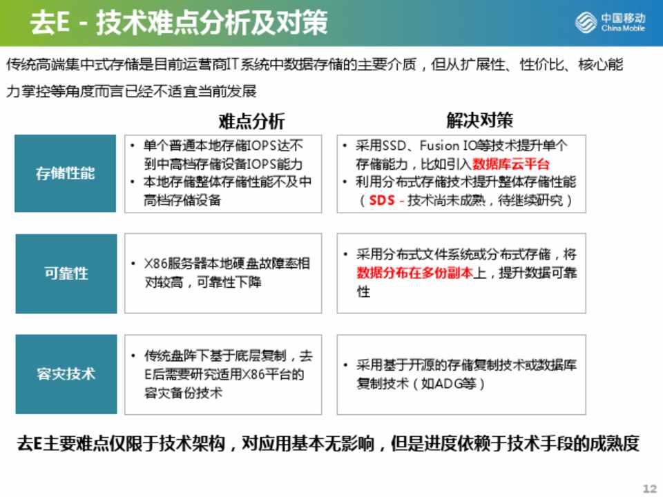 • 采用开源或国产数据库软件,并采用X86设备,彻底去“I”、“O”、“E” • 应用需要不同程度地重新设计与开发,以适应新数据库的特点,工作量大,现有技术积累
