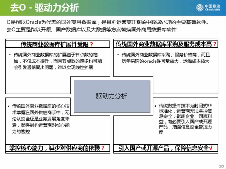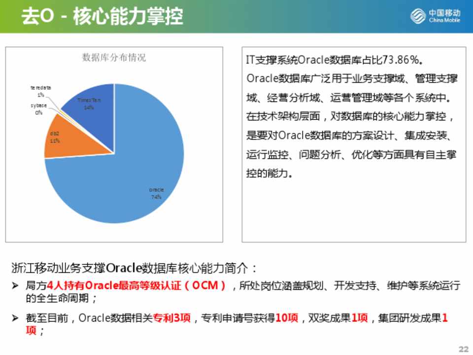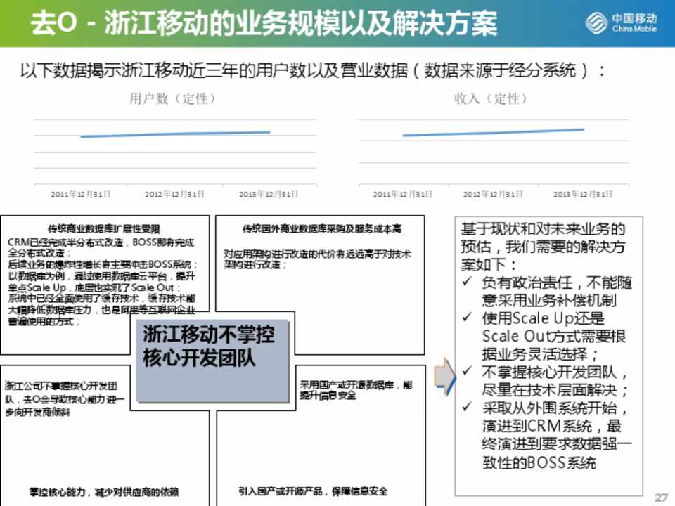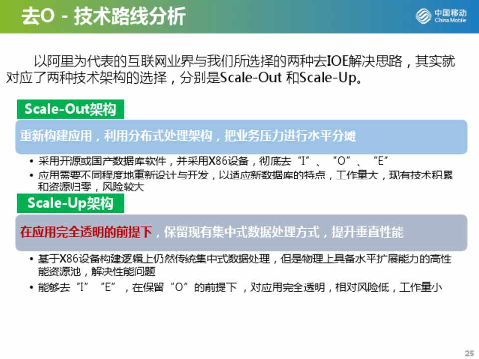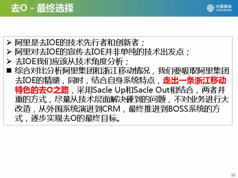 去IOE的精髓,同时,结合自身系统特点,走出一条浙江移动 特色的去O之路,采用Sacle Up和Sacle Out相结合,两者并 重的方式,尽量从技术层面解决碰到的问题,不对业务进行大 改造,从外围系统演进到CRM,最终推进到BOSS系统的方 式,逐步实现去O的最终目标。