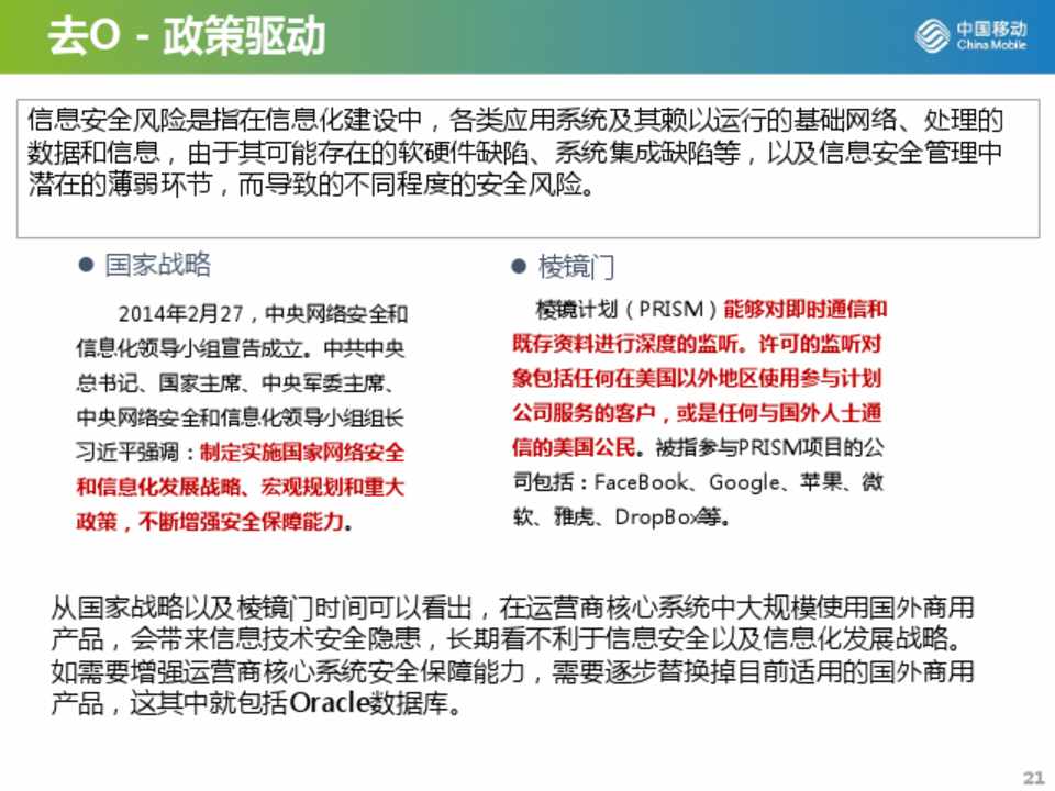 • 小型机技术封闭且非标准 化,运营商无法掌控信息安 全,可能影响企业、国家利 益,有必要引入国产或定制 产品,增强信息安全管控力 度