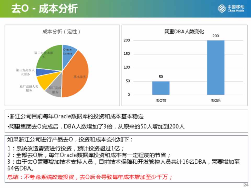 如果浙江公司进行产品去O,投资和成本变化如下: 1:系统改造需要进行投资,预计投资超过1亿; 2:全部去O后,每年Oracle数据库投资和成本有一定程度的节省; 3:由于去O需要增加技术支持人员,目前技术保障和开发管控人员共计16名DBA,需要增加至 64名DBA。 总结:不考虑系统改造投资,去O后会导致每年成本增加至少千万;
