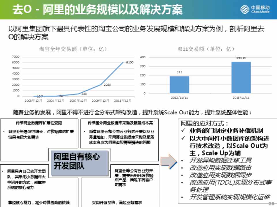 • 阿里具有自己的开发团 队,其采用小数据库大 中间件的方式,能掌控 系统的核心能力