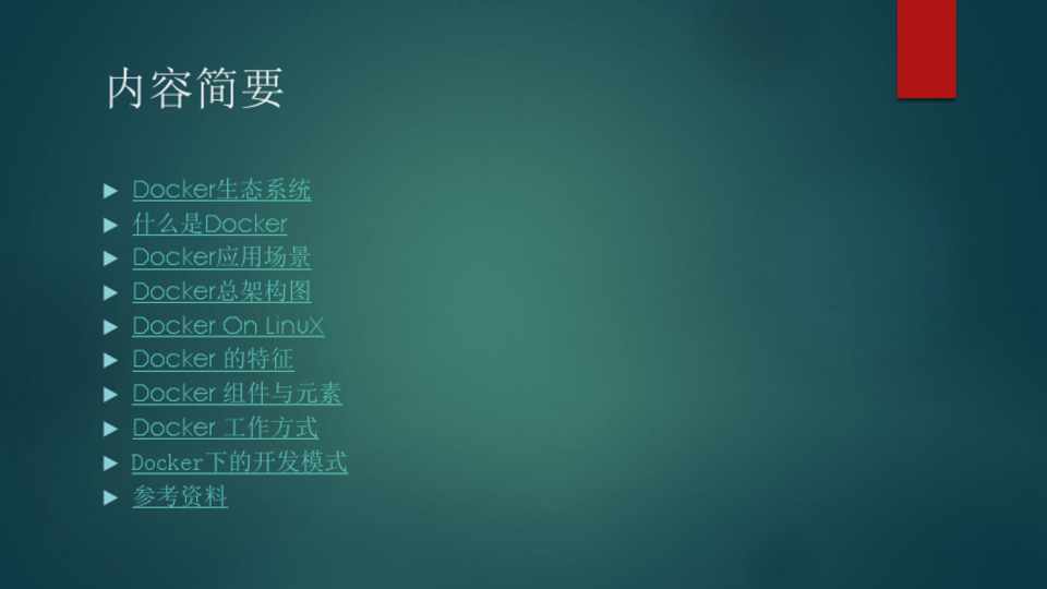 Docker生态系统 什么是Docker Docker应用场景 Docker总架构图 Docker On LinuX Docker 的特征 Docker 组件与元素 Docker 工作方式 Docker下的开发模式 参考资料