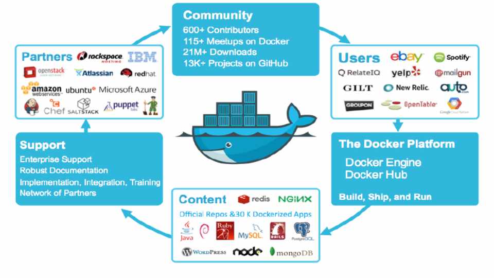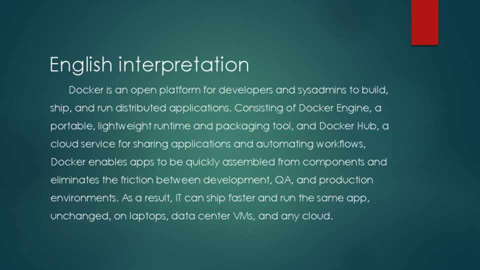 Docker is an open platform for developers and sysadmins to build, ship, and run distributed applications. Consisting of Docker Engine, a portable, lightweight runtime and packaging tool, and Docker Hub, a cloud service for sharing applications and automating workflows, Docker enables apps to be quickly assembled from components and eliminates the friction between development, QA, and production environments. As a result, IT can ship faster and run the same app, unchanged, on laptops, data center VMs, and any cloud.