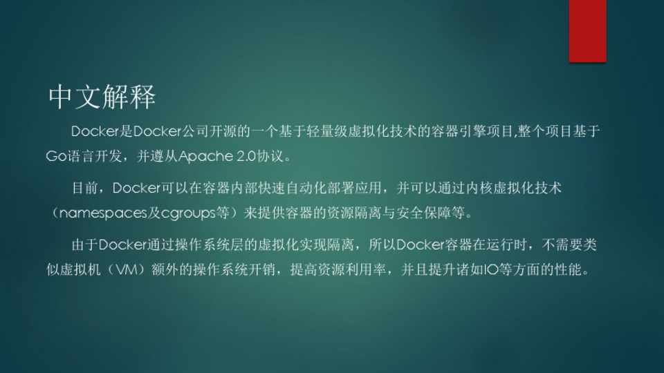 Docker是Docker公司开源的一个基于轻量级虚拟化技术的容器引擎项目,整个项目基于 Go语言开发,并遵从Apache 2.0协议。