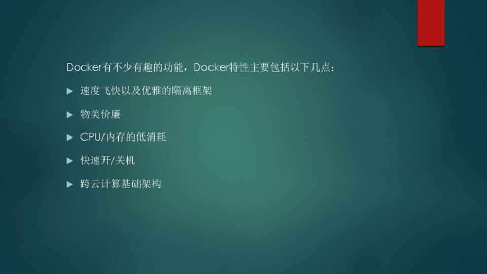 Docker有不少有趣的功能,Docker特性主要包括以下几点: 速度飞快以及优雅的隔离框架 物美价廉 CPU/内存的低消耗 快速开/关机 跨云计算基础架构