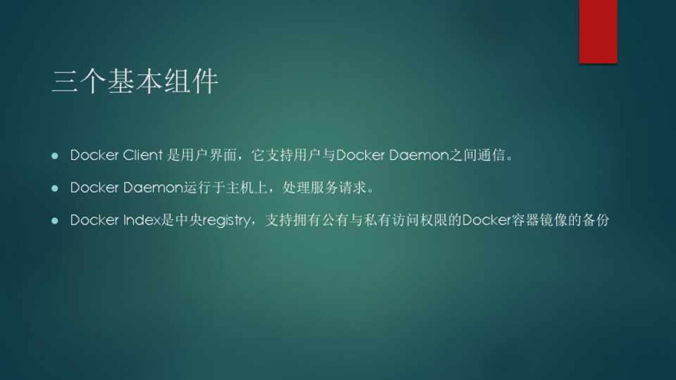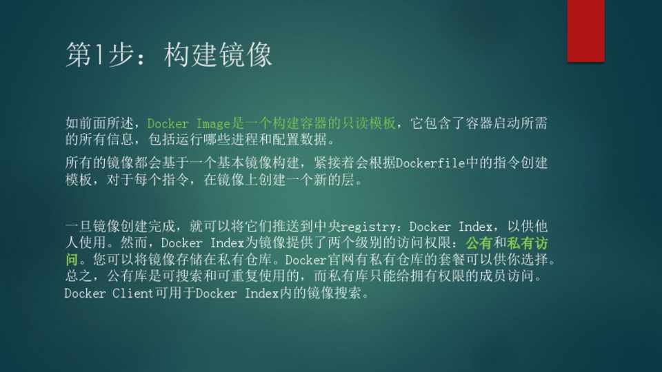 一旦镜像创建完成,就可以将它们推送到中央registry:Docker Index,以供他 人使用。然而,Docker Index为镜像提供了两个级别的访问权限:公有和私有访 问。您可以将镜像存储在私有仓库。Docker官网有私有仓库的套餐可以供你选择。 总之,公有库是可搜索和可重复使用的,而私有库只能给拥有权限的成员访问。 Docker Client可用于Docker Index内的镜像搜索。