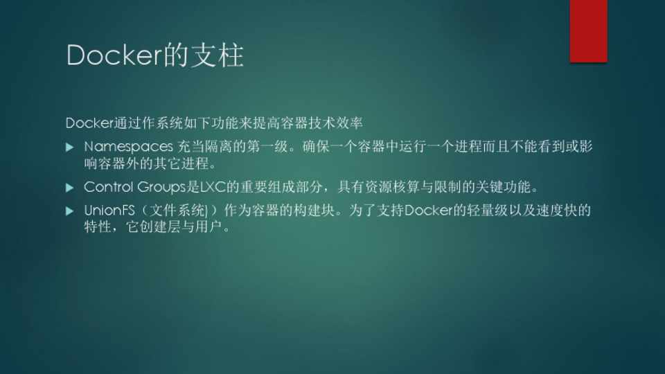 响容器外的其它进程。 Control Groups是LXC的重要组成部分,具有资源核算与限制的关键功能。 UnionFS(文件系统))作为容器的构建块。为了支持Docker的轻量级以及速度快的