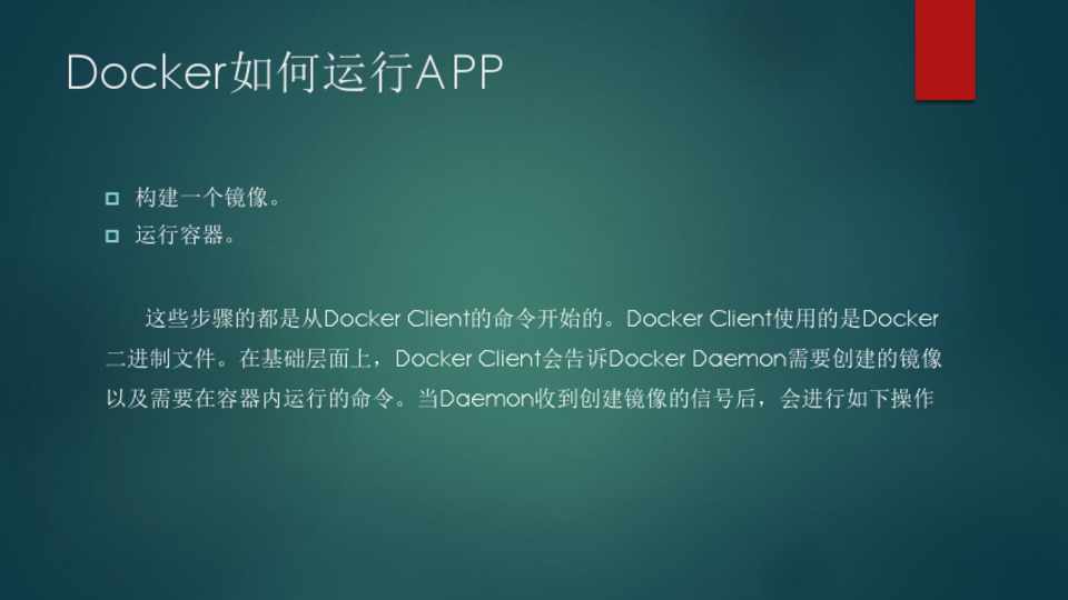 这些步骤的都是从Docker Client的命令开始的。Docker Client使用的是Docker 二进制文件。在基础层面上,Docker Client会告诉Docker Daemon需要创建的镜像 以及需要在容器内运行的命令。当Daemon收到创建镜像的信号后,会进行如下操作