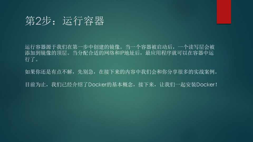 运行容器源于我们在第一步中创建的镜像。当一个容器被启动后,一个读写层会被 添加到镜像的顶层。当分配合适的网络和IP地址后,最应用程序就可以在容器中运 行了。 如果你还是有点不解,先别急,在接下来的内容中我们会和你分享很多的实战案例。 目前为止,我们已经介绍了Docker的基本概念,接下来,让我们一起安装Docker!