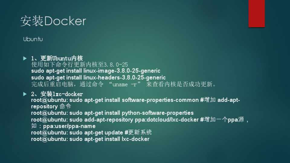 2、安装lxc-docker root@ubuntu: sudo apt-get install software-properties-common #增加 add-aptrepository 命令 root@ubuntu: sudo apt-get install python-software-properties root@ubuntu: sudo add-apt-repository ppa:dotcloud/lxc-docker #增加一个ppa源, 如:ppa:user/ppa-name root@ubuntu: sudo apt-get update #更新系统 root@ubuntu: sudo apt-get install lxc-docker