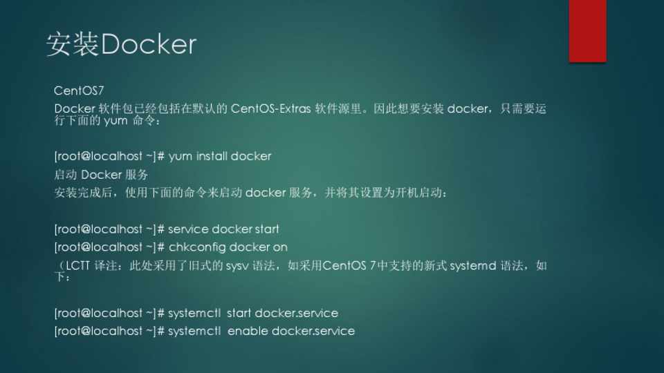 [root@localhost ~]# service docker start [root@localhost ~]# chkconfig docker on (LCTT 译注:此处采用了旧式的 sysv 语法,如采用CentOS 7中支持的新式 systemd 语法,如 下: