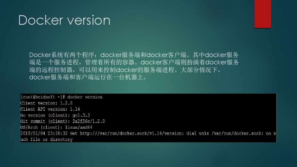 Docker系统有两个程序:docker服务端和docker客户端。其中docker服务 端是一个服务进程,管理着所有的容器。docker客户端则扮演着docker服务 端的远程控制器,可以用来控制docker的服务端进程。大部分情况下, docker服务端和客户端运行在一台机器上。