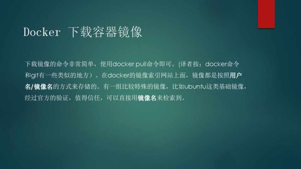 下载镜像的命令非常简单,使用docker pull命令即可。(译者按:docker命令 和git有一些类似的地方)。在docker的镜像索引网站上面,镜像都是按照用户 名/镜像名的方式来存储的。有一组比较特殊的镜像,比如ubuntu这类基础镜像, 经过官方的验证,值得信任,可以直接用镜像名来检索到。