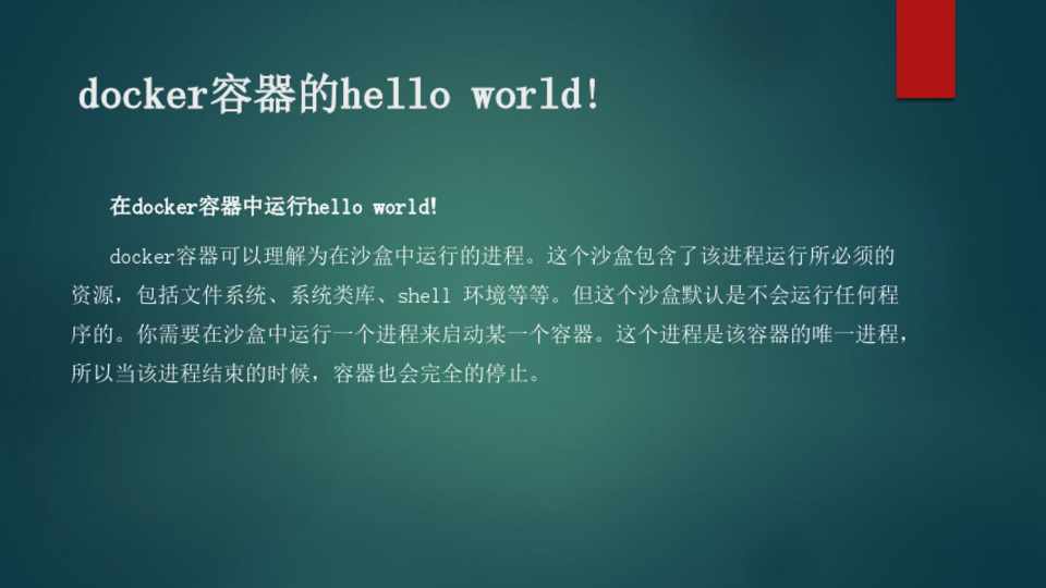 在docker容器中运行hello world! docker容器可以理解为在沙盒中运行的进程。这个沙盒包含了该进程运行所必须的 资源,包括文件系统、系统类库、shell 环境等等。但这个沙盒默认是不会运行任何程 序的。你需要在沙盒中运行一个进程来启动某一个容器。这个进程是该容器的唯一进程, 所以当该进程结束的时候,容器也会完全的停止。