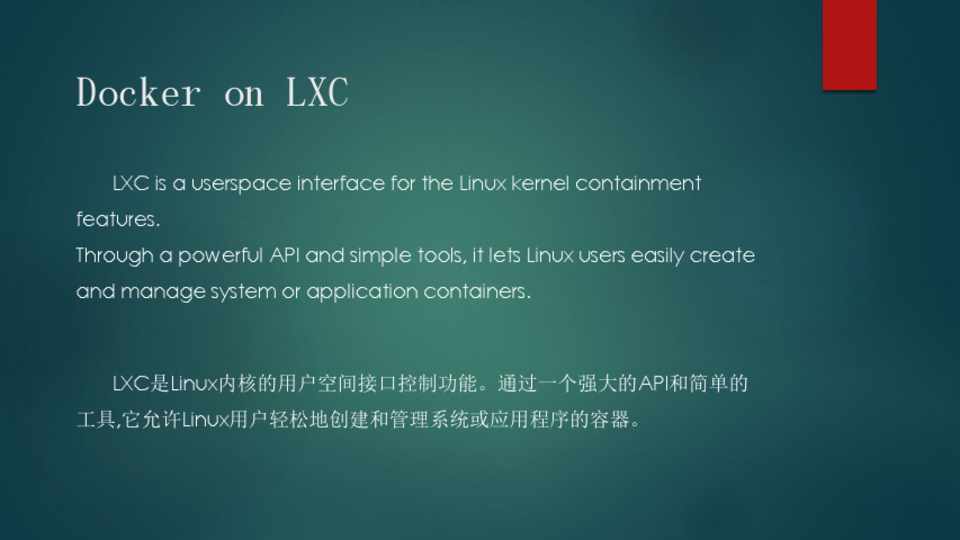 LXC是Linux内核的用户空间接口控制功能。通过一个强大的API和简单的 工具,它允许Linux用户轻松地创建和管理系统或应用程序的容器。